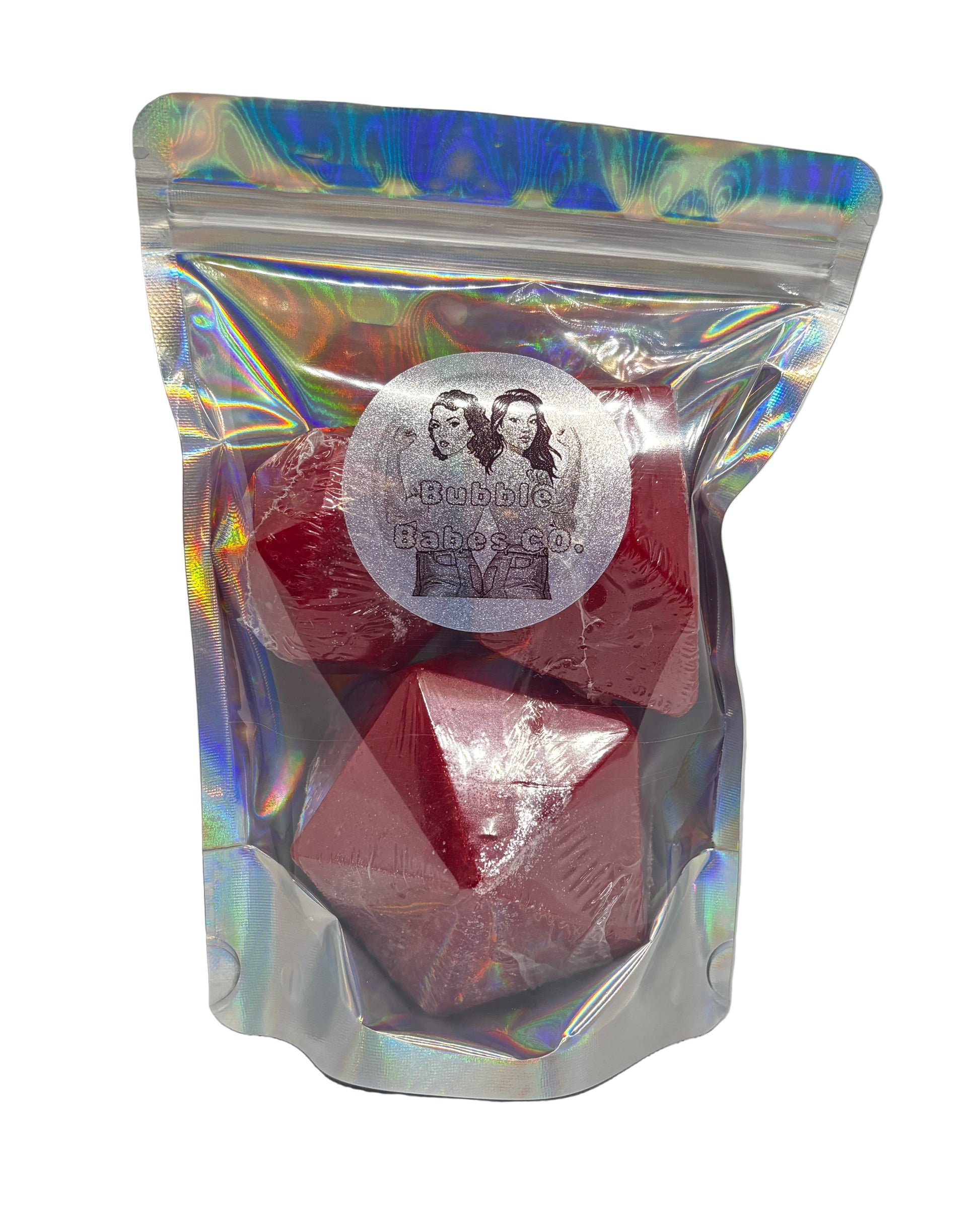 Poured with a hydrating glycerin base and brilliant ruby mica, cut into a gemstone shape that glows in the light.